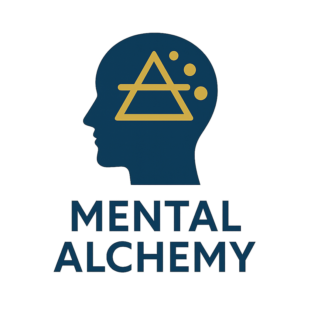 • A blue silhouette of a person's head with a yellow triangle and circles inside it, representing mental processes or creativity, along with the words "Mental Alchemy" beneath.